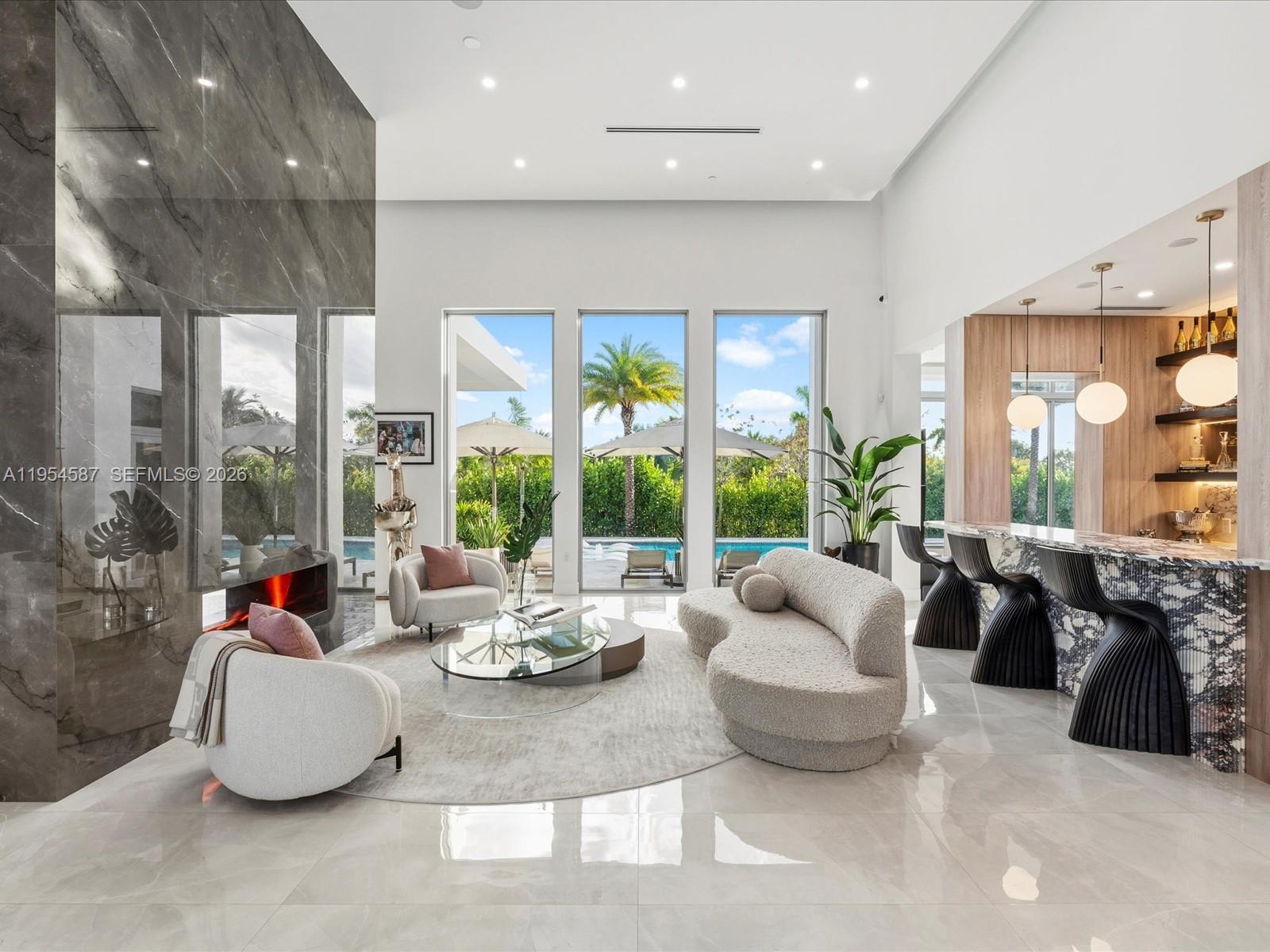 Soaring ceilings, walls of glass, and curated materials define the open living spaces, creating seamless flow between living, dining, and entertaining areas. A statement kitchen, architectural wine wall, and designer bar anchor the home. The primary suite offers a serene retreat with spa-level finishes and generous walk-in closets, while four additional bedrooms are thoughtfully positioned on the opposite wing for privacy. Expansive sliding glass doors fully open to the outdoors, where resort-style living unfolds with a pool and oversized spa, covered terraces, a fireplace, and lush landscaping designed for privacy and relaxation.