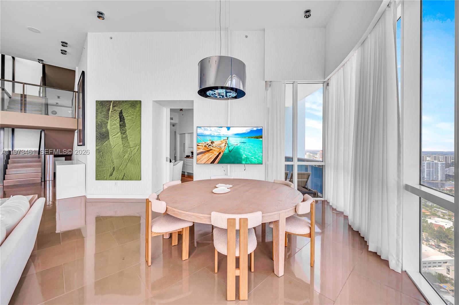 Spanning approximately 4,141 square feet, the penthouse features four bedrooms, a den, two living areas, and two kitchens, including a main kitchen and a breakfast kitchen. Soaring 21+ foot ceilings, a dramatic glass staircase, and a private internal elevator create an open and sophisticated living environment.