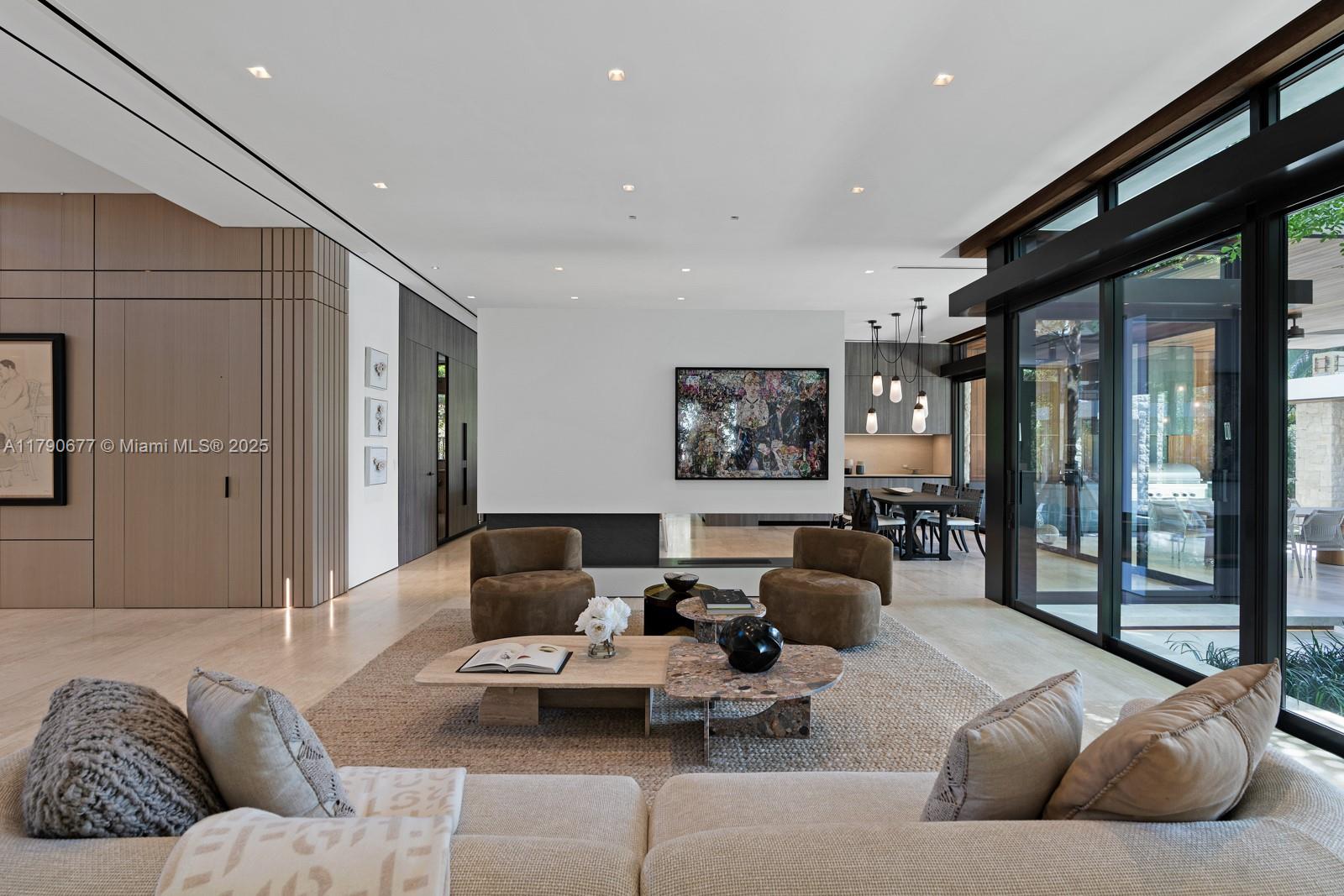 GOLDEN BEACH SEC D PB 10-10 LOT 26 & S35FT OF LOT 27 BLK J LOT SIZE 85.000 X 165 OR 13484-0661 1187 1 COC 21713-1922 09 2003 1 Glamour in Golden Beach! Masterfully designed, this 2025 residence sets a new benchmark in waterfront modernism. Hand-placed stone, iroko wood, and clear glass interlace a 100-year olive tree. The grand foyer achieves 24' heights highlighting Italian oak-paneled walls that lead to a sophisticated salon. Curated by Fanny Haim, the worldly interiors include a travertine bar in the bespoke media lounge, and stylized fireplaces & drapery throughout. The exceptional MiaCucina kitchen revolves around a bright breakfast area. An architectural staircase arrives to the primary suite’s dual dressing rooms and spacious marble bath enhanced by an upstairs library. A theater, office, gym, elevator & staff room complete the home. The resort pool shines with a cabana, Summer Kitchen, new dock + seawall.